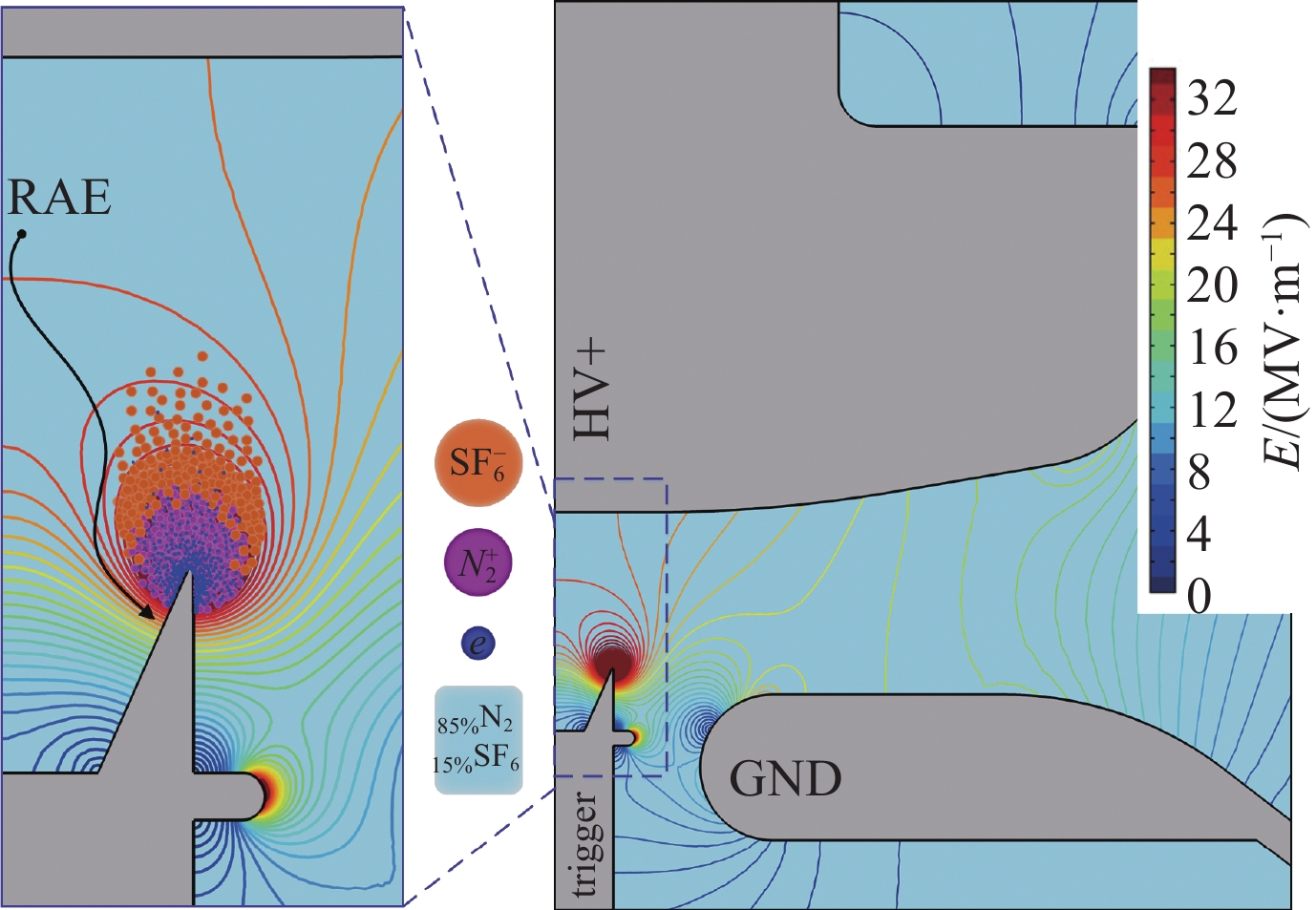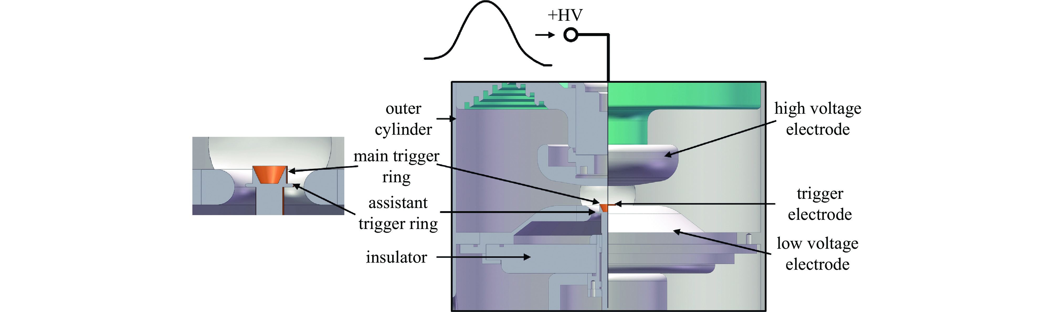 Abstract: To achieve precise control of the main triggered switch of the pulsed power source, a triggered gas switch based on the principle of corona stabilization was developed. The process of stabilized corona discharge and the influence of high-energy runaway electrons on the stability of breakdown were analyzed. This study also revealed the mechanism by which suppressing high-energy runaway electrons was beneficial in increasing the stability of gas switch self-breakdown. The experimental study was carried out from the perspectives of gas medium and E-field conditions, and the self-breakdown stability of the gas switch was compared. The self-breakdown dispersion of the gas switch filled with 15% SF6/N2 mixed gas was no more than 6% within the pressure of 0.06 MPa to 0.56 MPa, while the lowest value was 1.4%. The self-breakdown voltage dispersion remained within the range of 2%-4% when the electrically negative gas content in the SF6/N2 mixed gas was less than 30%. Within the charging voltage range of less than1800 V, by changing the time-domain variation speed of the E-field in the gap, the self-breakdown voltage dispersion could be reduced to 0.2% with the breakdown voltage of 242 kV, while the voltage on the high voltage electrode rising speed was 12.4 kV/μs. However, reducing the field non-uniform coefficient didn`t significantly improve the breakdown stability in the 15% SF6/N2 mixed gas at 0.3 MPa, but the self-breakdown voltage dispersion was still kept below 1% when the voltage rising speed increased on the high voltage electrode. By replacing the wedge-shaped trigger electrode with a groove-shaped trigger electrode, the minimum self-breakdown voltage dispersion could be as low as 0.15%, and the breakdown voltage was stabilized around 248 kV. -