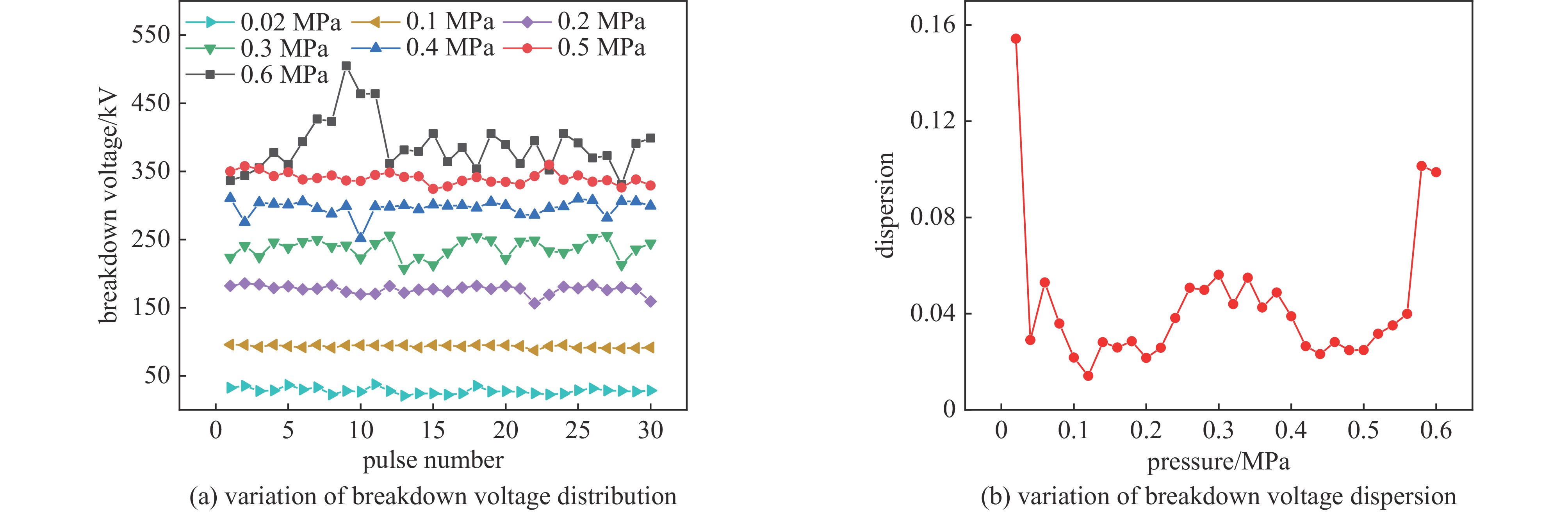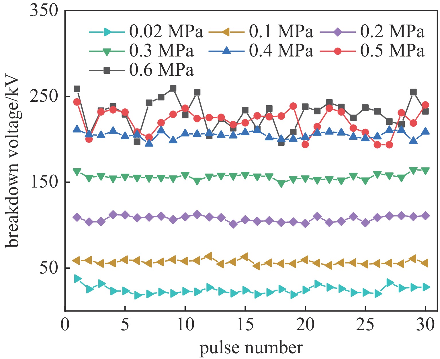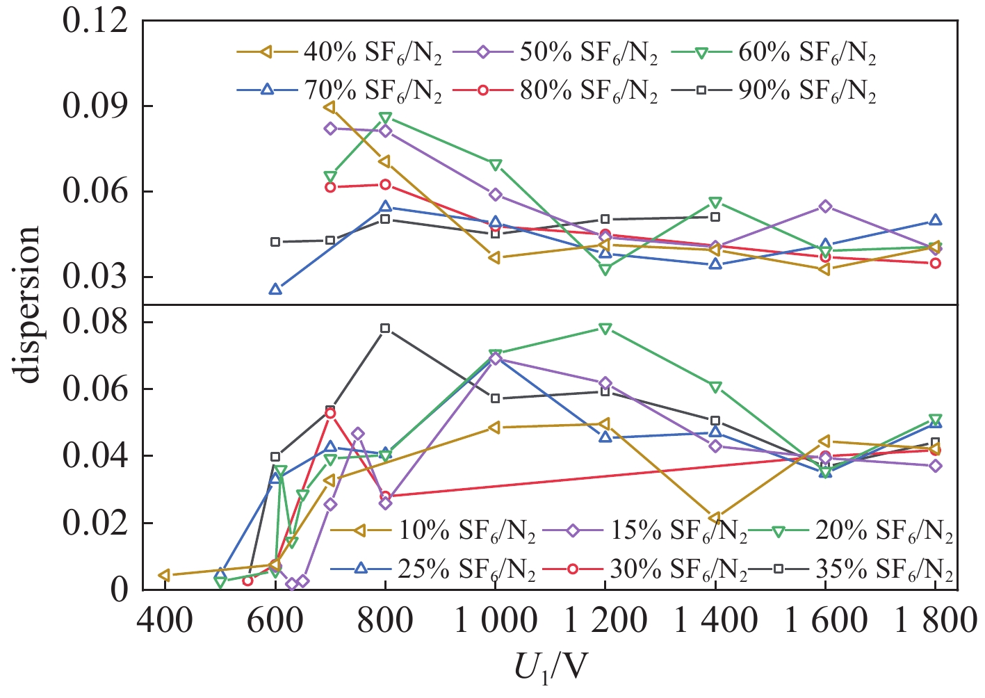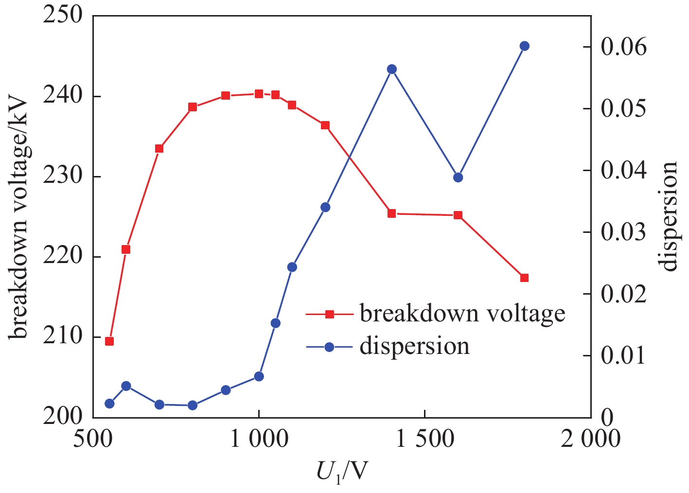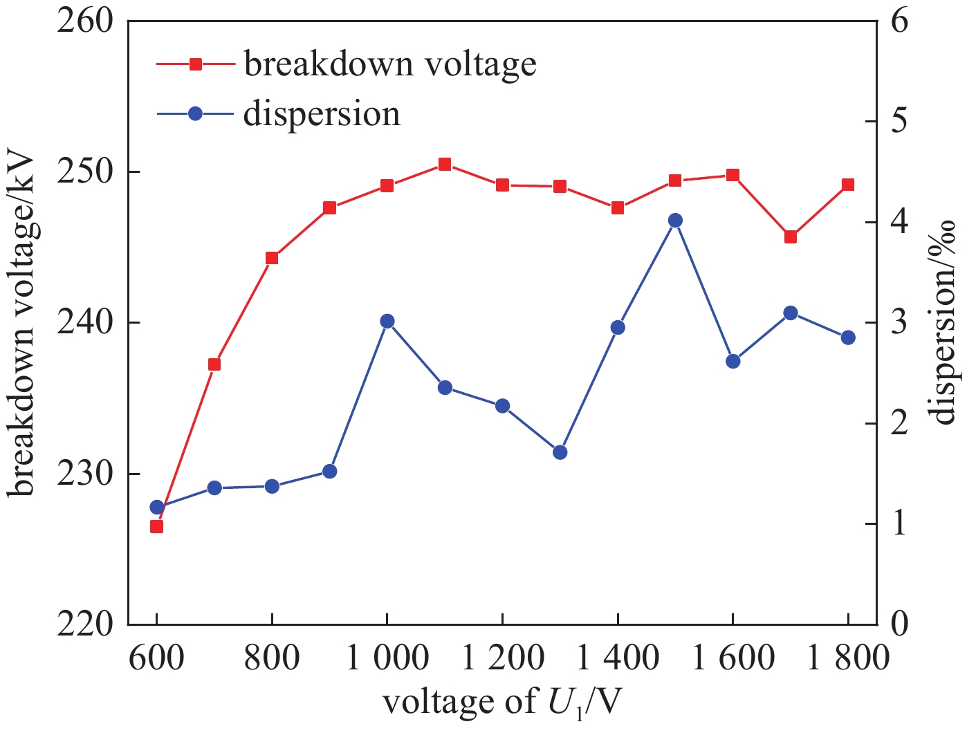 1800 V范围内,改变间隙内电场的时域变化速度,可降低自击穿电压的离散度,当电压上升速度为12.4 kV/μs时,自击穿电压为242 kV,离散度为0.2%;在0.3 MPa的15%SF6/N2混合气体内,降低触发极尖端的场不均匀系数,击穿稳定性未得到明显改善,但是在电场时域变化速度增加时,自击穿电压离散度依然可以保持在1%以下;利用沟槽型触发极代替楔形触发极,击穿电压离散度最低可达0.15%,且击穿电压稳定在248 kV附近。-