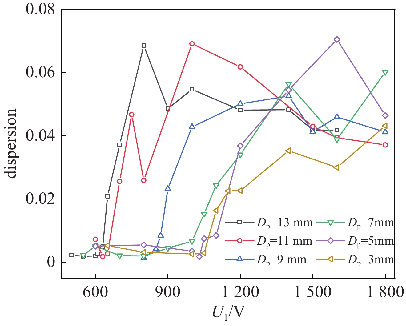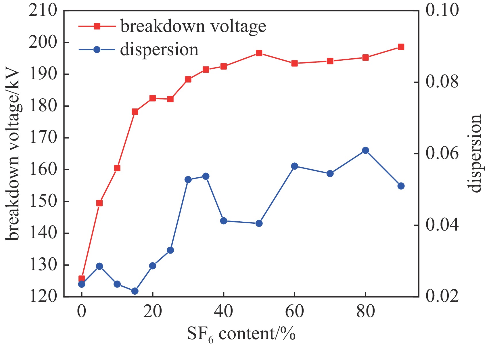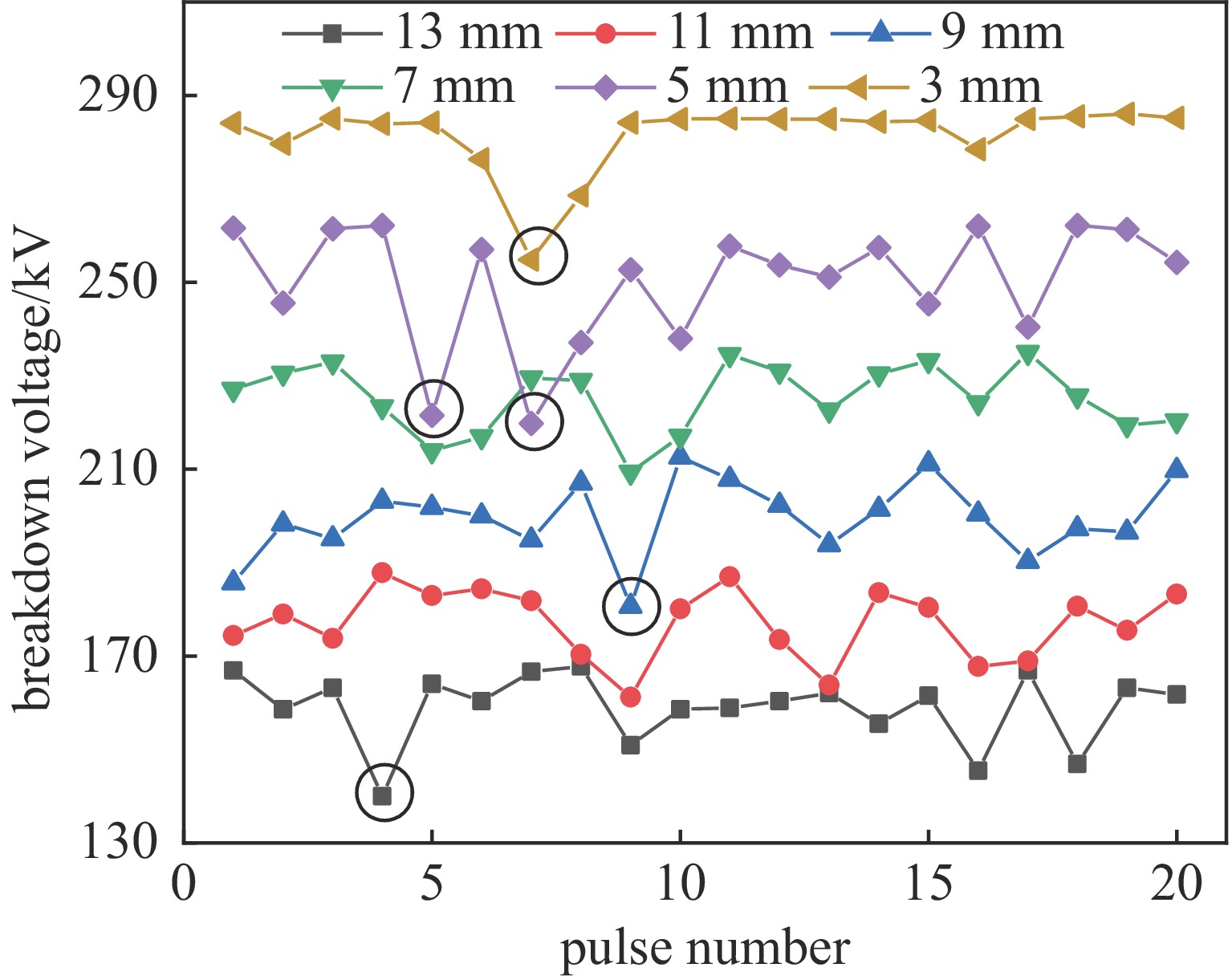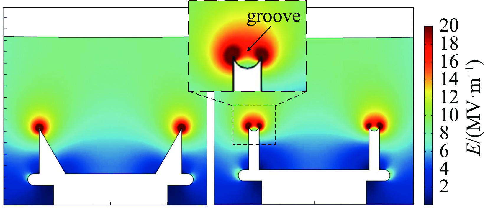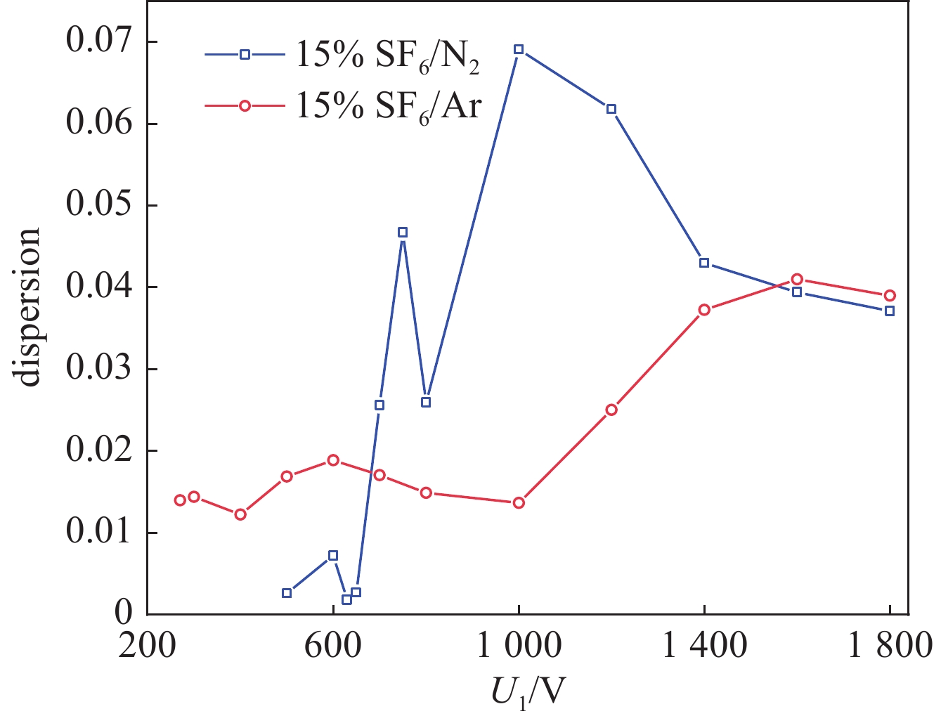 1800 V范围内,改变间隙内电场的时域变化速度,可降低自击穿电压的离散度,当电压上升速度为12.4 kV/μs时,自击穿电压为242 kV,离散度为0.2%;在0.3 MPa的15%SF6/N2混合气体内,降低触发极尖端的场不均匀系数,击穿稳定性未得到明显改善,但是在电场时域变化速度增加时,自击穿电压离散度依然可以保持在1%以下;利用沟槽型触发极代替楔形触发极,击穿电压离散度最低可达0.15%,且击穿电压稳定在248 kV附近。-