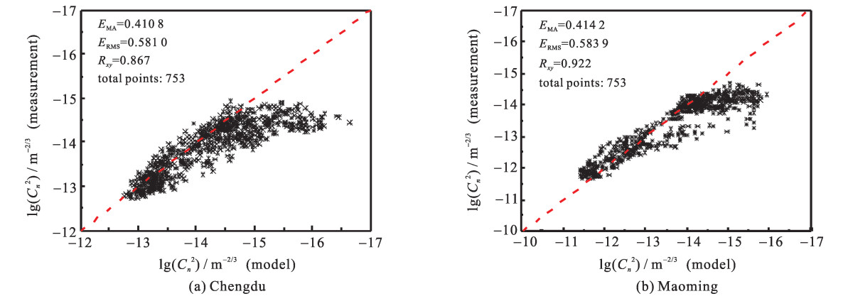 摘要: 基于Monin-Obukhov相似性理论,采用MARIAH算法,利用成都和茂名两个地区、两个高度层上的温度、湿度、风速等常规气象参数估算折射率结构常数,并对估算值与温度脉动仪测量值进行比较分析。结果显示:利用常规气象参数估算得到的成都与茂名的折射率结构常数在变化趋势及量级上基本符合温度脉动仪测量值。成都和茂名的折射率结构常数估算值与测量值的相关系数分别为0.86与0.92,平均绝对值偏差分别为0.410与0.414。因此,采用MARIAH算法估算陆地和近海面大气光学折射率结构常数是可行的;茂名中午时刻的折射率结构常数峰值比成都大一个量级。Abstract: The refractive index structure constant is estimated and compared with measured values from micro-thermometer by using the meteorological parameters of Chengdu and Maoming, such as temperature, humidity and wind speed on two altitudes. The estimated model adopts MARIAH algorithm, which is based on the Monin-Obukhov similarity theory. The result shows that it is feasible to calculate the structure parameter by MARIAH algorithm. The trend and order of magnitude of the estimated structure constant fit well to that of the measured data. The correlation coefficients between estimated and measured values of two places are 0.86 and 0.92 while the mean absolute error values are 0.410 and 0.414 respectively. Besides, the estimated structure constant of Maoming is one order of magnitude larger than that of Chengdu.