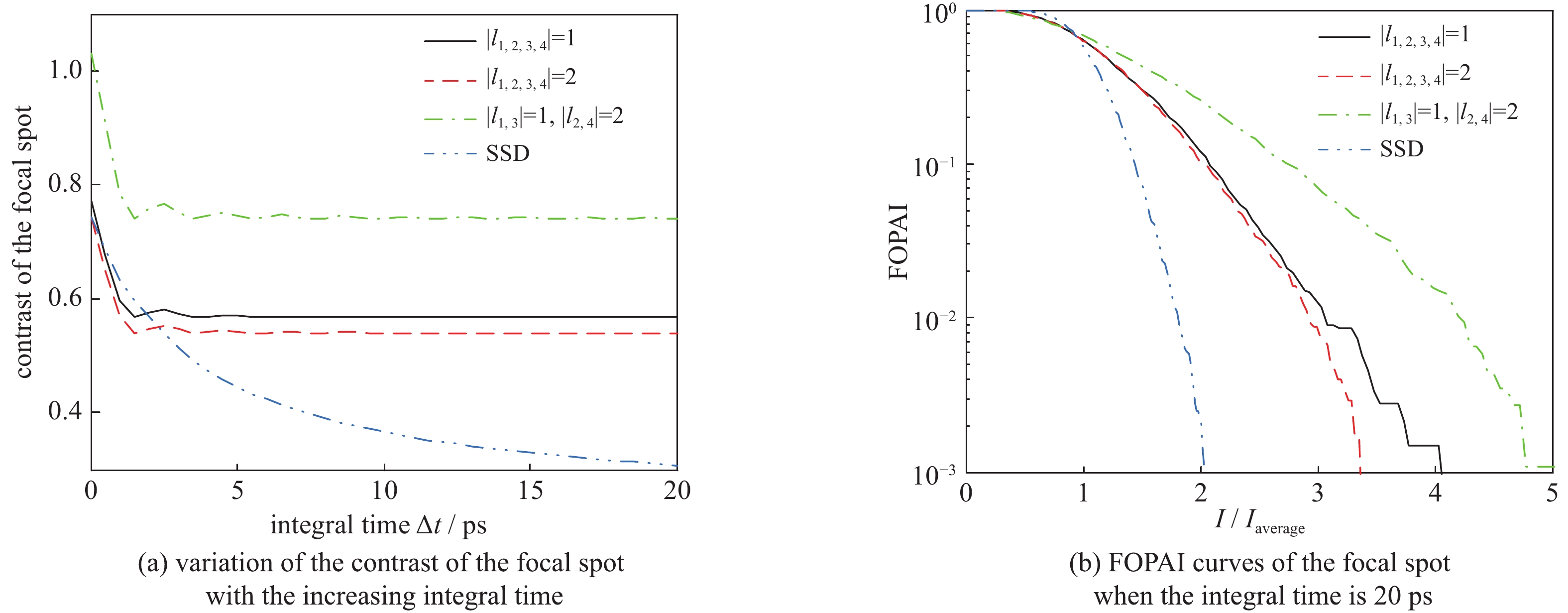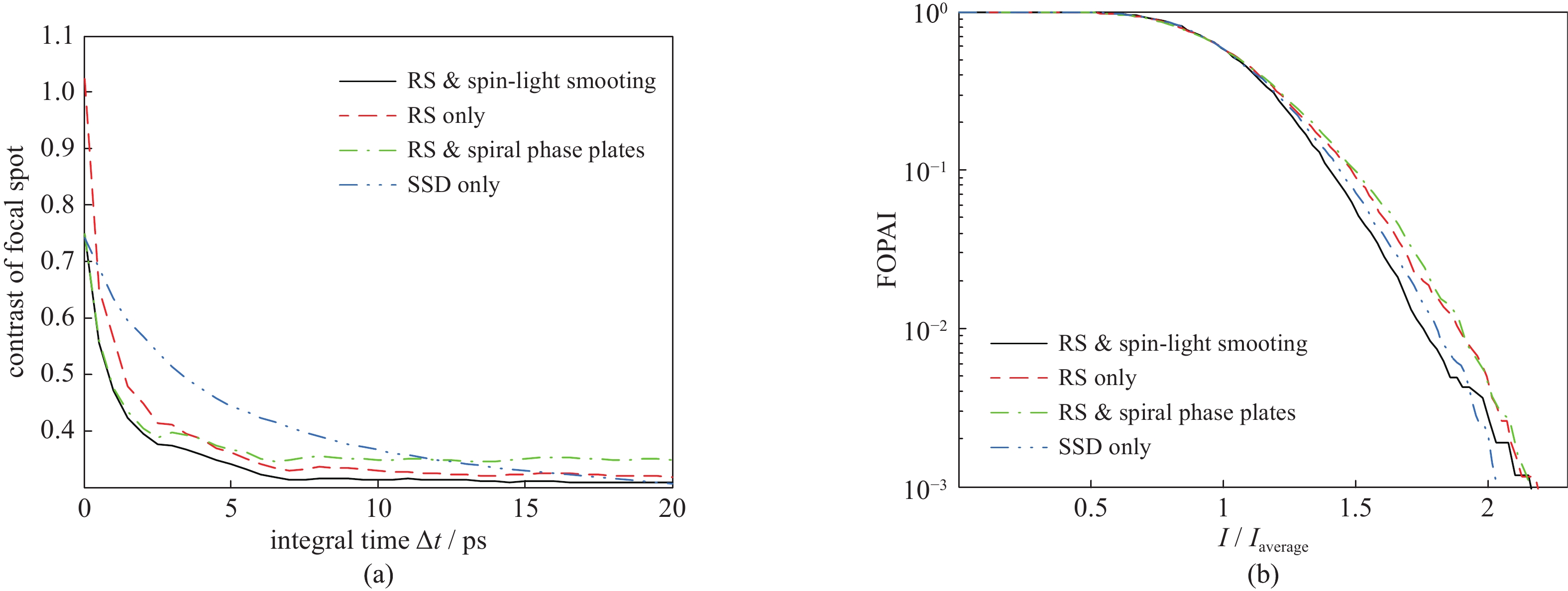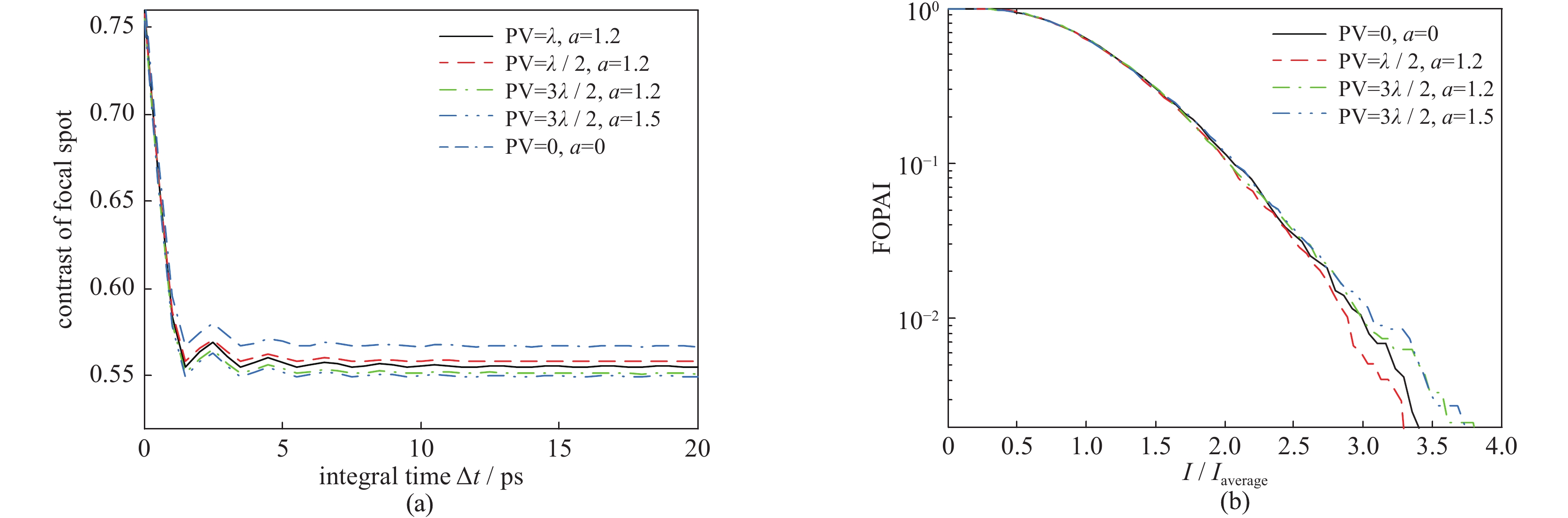 Figure 8. (a) Variation of the contrast of the focal spot with the integral time when the beamlets have different beam quality. PV denotes the peak-to-mean value of the wavefront distortion, and a denotes the max-to-mean value of the amplitude modulation. (b) FOPAI curves of the focal spot when the integral time is 5 ps