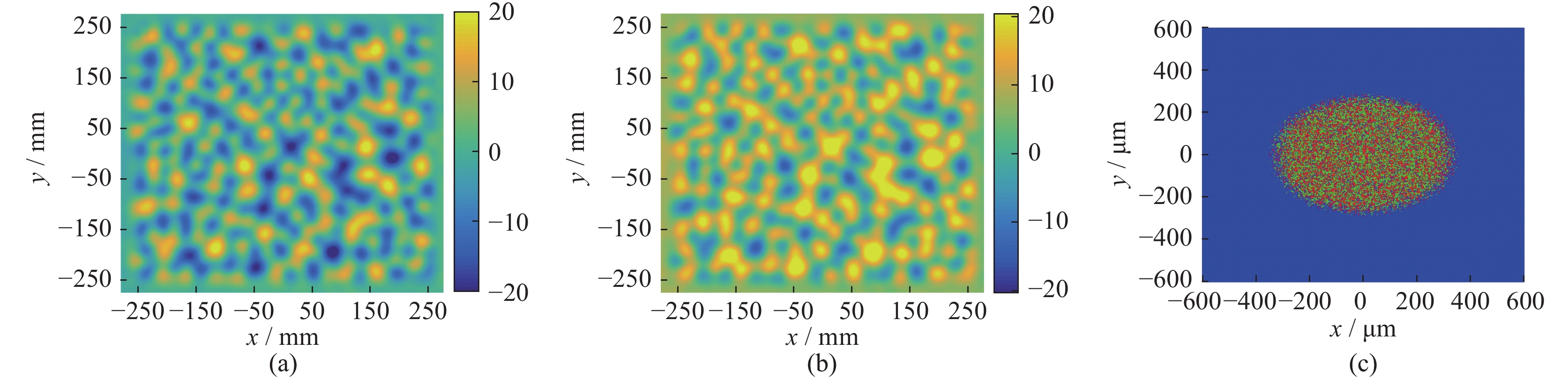 Figure 4. Surface shape of an original CPP (a) and its conjugate CPP (b). (c) is the far-field intensity distributions of a same laser beam after propagating through these two CPPs. Red regions shows the speckles generated by the original CPP, and green regions within the focal spot show the speckles generated by the conjugate CPP