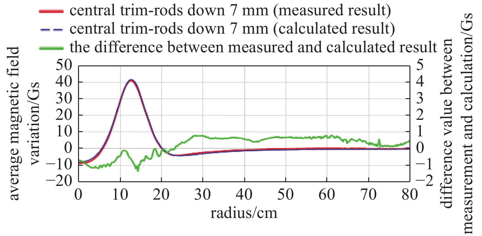 图  7  调节磁场调节棒前后磁场变化理论值与测量值